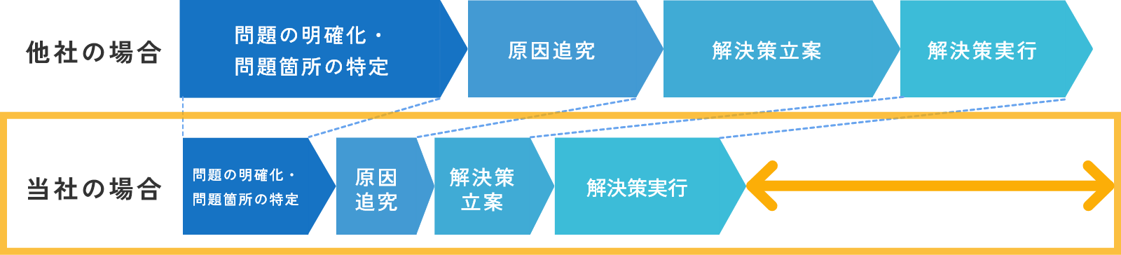 問題の明確化・問題箇所の特定を行い、原因追究後、解決策立案をご提案いたします。